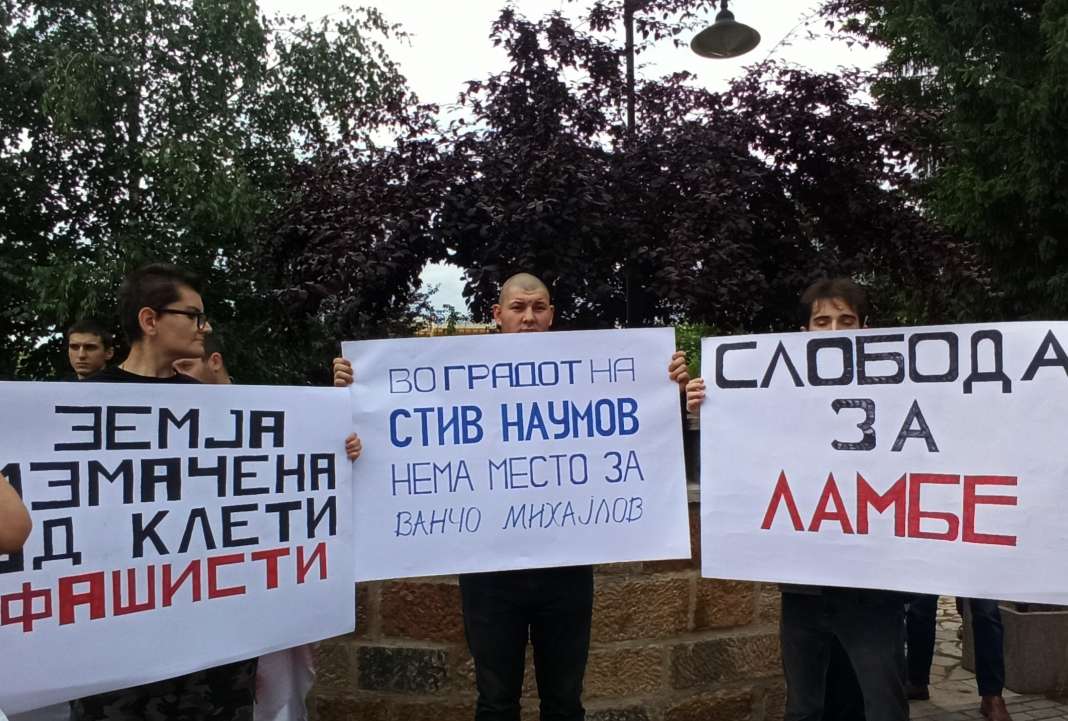 Слобода за Ламбе“, „Во градот на Стив Наумов нема место за Ванчо Михајов“ беа дел од пораките испишани на транпарентите на граѓаните кои протесираа пред полицијата во Битола, со барање за слобода пејачот Ламбе Алабаковски, кој е во притвор, откако го призна подметнувањето на пожарот во бугарскиот клуб „Ванчо Михајлов“ во Битола, изминатиот викенд.